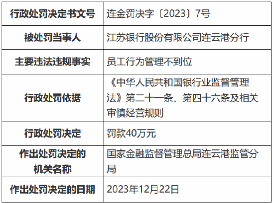 12月29日金融一线音尘,国度金融监督贬责总局连云港监管分局行政处罚信息公开表明白,江苏银行股份有限公司连云港分行因职工活动贬责不到位,被罚金40万元。